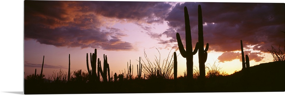 <p>Long horizontal canvas of the silhouettes of cactuses against a sunset with layered clouds.</p>