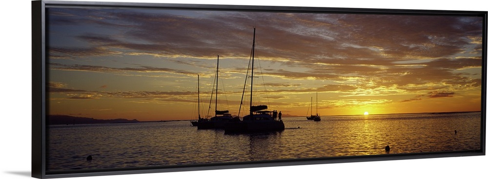 <p>Panoramic photograph on a big wall hanging of several silhouetted sailboats, floating on calm waters as the sun sets on the horizon, in Tahiti, French Polynesia.</p>