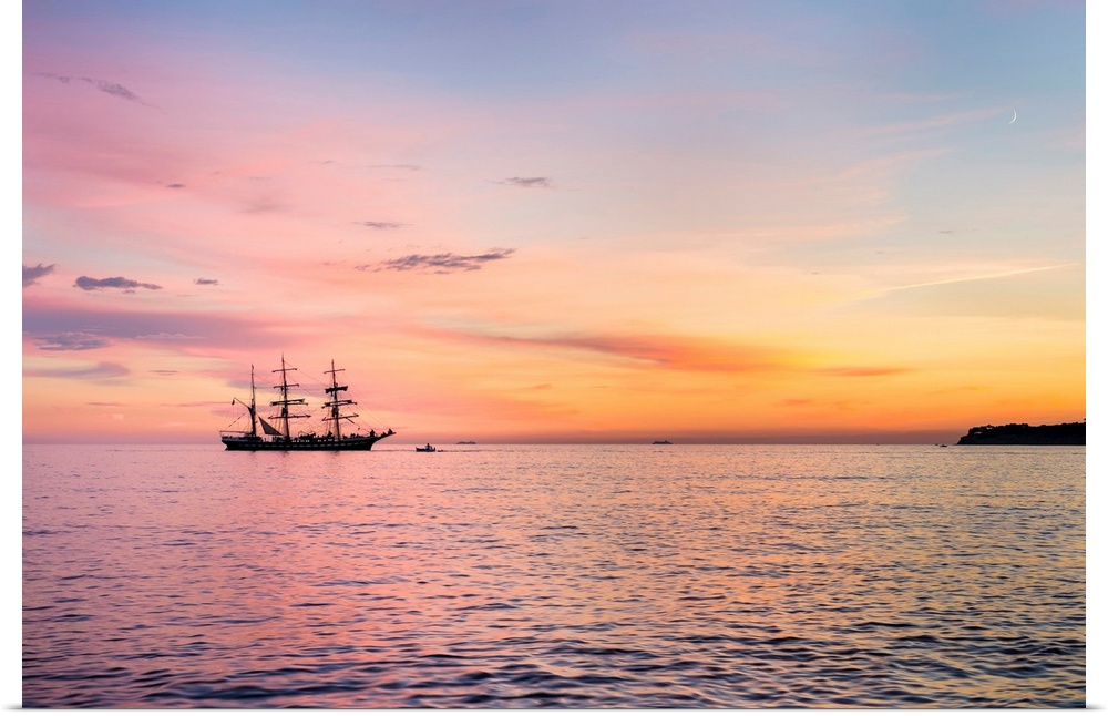 <p>Silhouette of sailing ship at sunset off the coast of Cassis, Bouches-du-Rhone, Provence-Alpes-Cote d'Azur, France.</p>