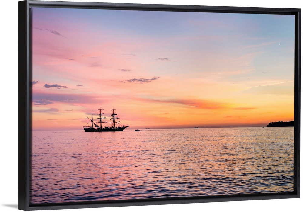 <p>Silhouette of sailing ship at sunset off the coast of Cassis, Bouches-du-Rhone, Provence-Alpes-Cote d'Azur, France.</p>