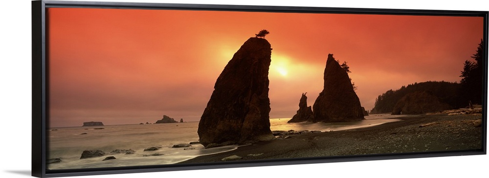 <p>This is a panoramic photograph of the sun setting behind enormous rock formations on this rocky Northwestern beach.</p>