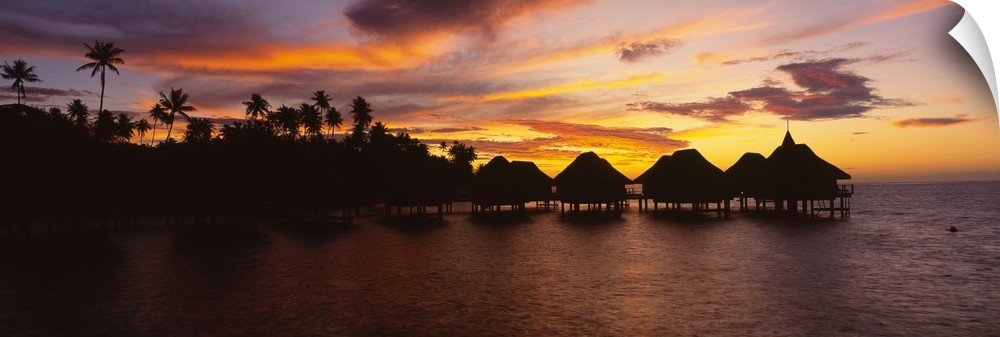 <p>Long and narrow photo on canvas of palm trees and houses on stilts over the ocean silhouetted against a bright sunset.</p>