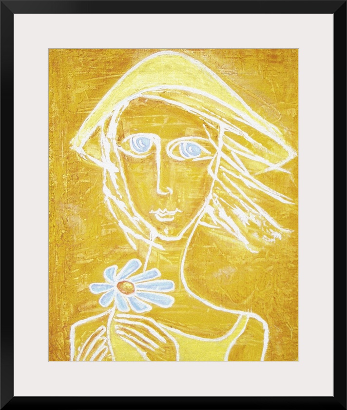 <p>Originally an abstract acrylic painting. Silhouette of sunny girl with blue eyes and blue flower in her hands on a yellow grunge background.</p>