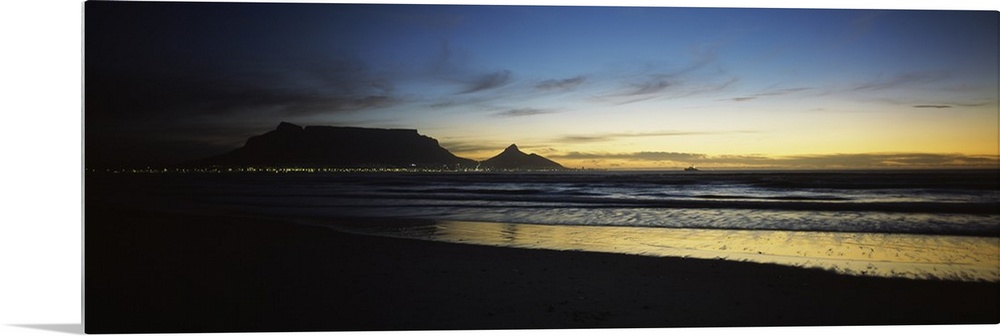 <p>Panoramic photograph of shoreline at dusk under a cloudy sky with mountain range silhouette in the distance.</p>