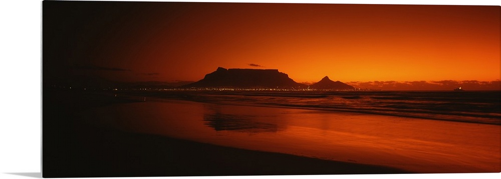 <p>Wide angle, large photograph of sunset at the shoreline near Table Bay in Western Cape Province, South Africa. The outline of Table Mountain can bee seen on the horizon.</p>