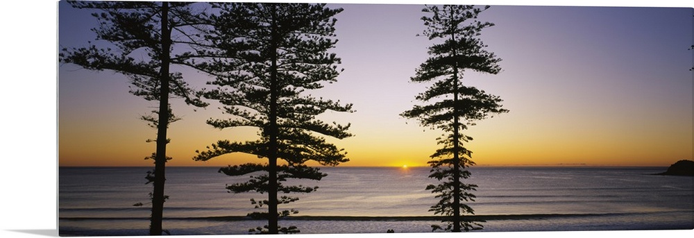 <p>Panoramic canvas of the silhouette of trees against a sunrise on the water.</p>
