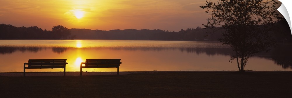 <p>Panoramic photograph of park benches near water's edge at sunset with forest silhouette in the distance.</p>