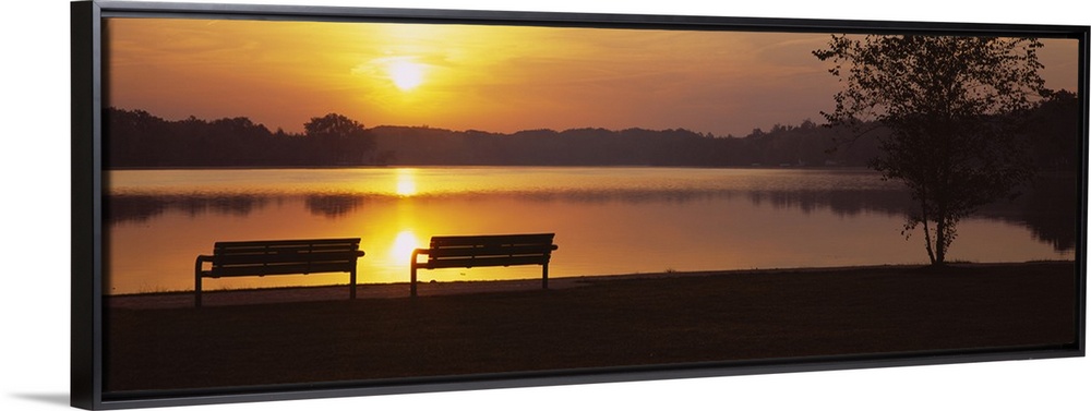 <p>Panoramic photograph of park benches near water's edge at sunset with forest silhouette in the distance.</p>
