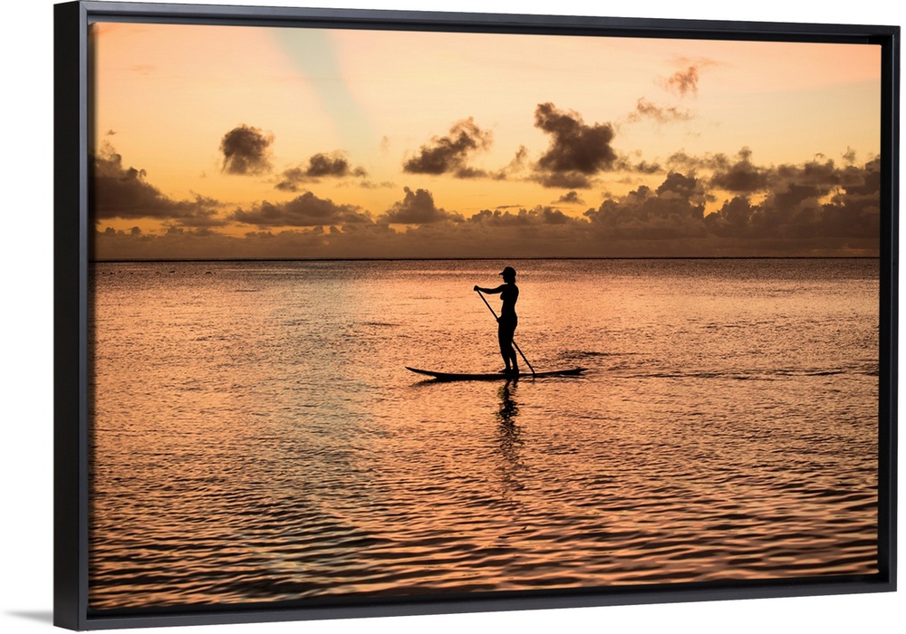 <p>Silhouette of woman paddleboarding in the Pacific Ocean, Bora Bora, Society Islands, French Polynesia</p>