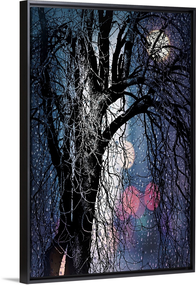 <p>Tree silhouette with ghostly highlights, in the rain.</p>