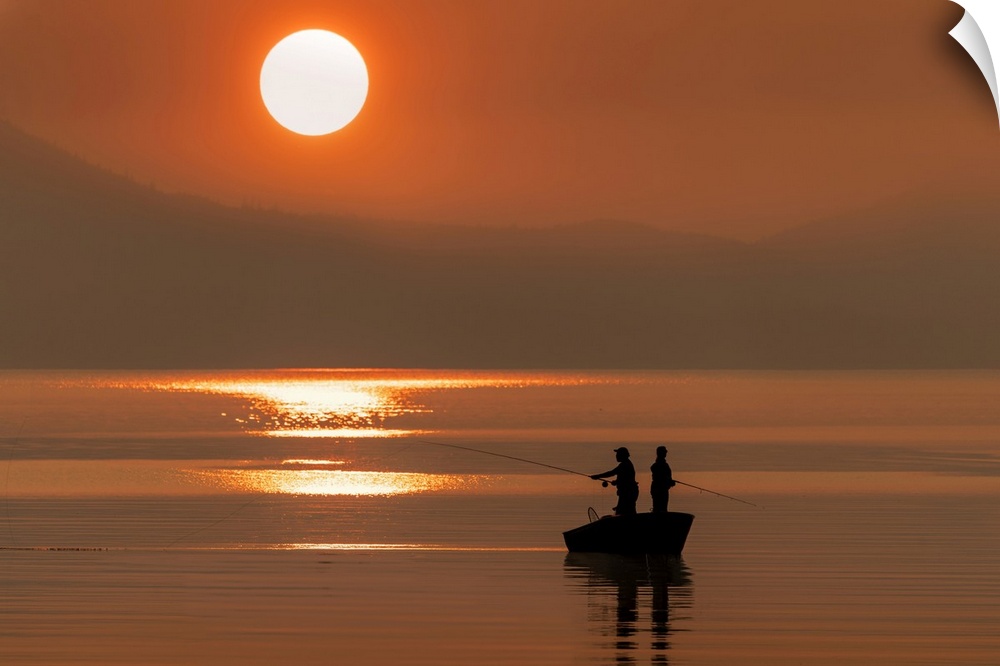 <p>Silhouetted anglers standing in a boat fishing for salmon at sunset; Juneau, Alaska, United States of America</p>