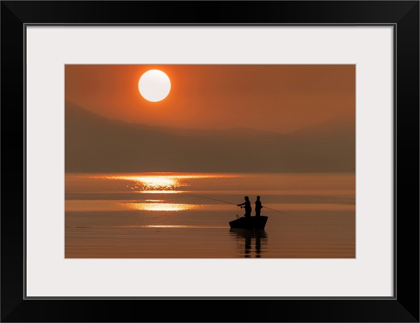 <p>Silhouetted anglers standing in a boat fishing for salmon at sunset; Juneau, Alaska, United States of America</p>