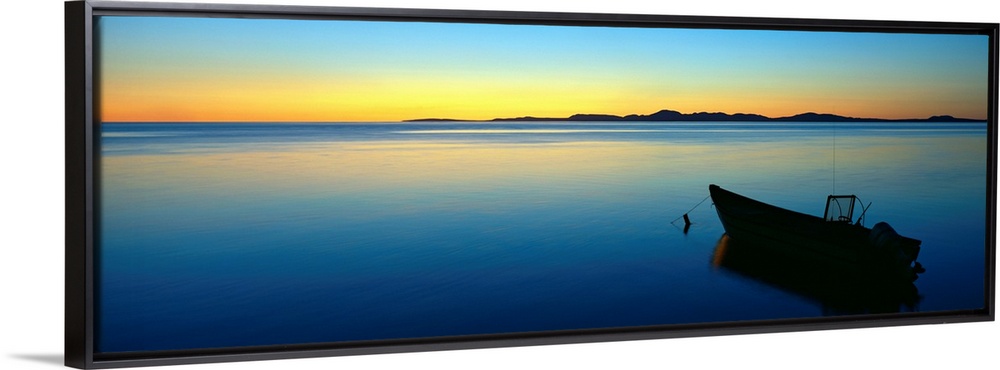 <p>Lonely boat resting on the calm ocean as the fading sun emits a golden glow on the horizon.</p>