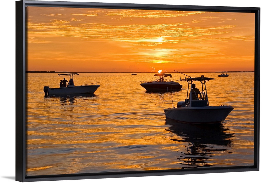 <p>Silhouetted boats and shimmering water during a picture perfect sunset.</p>