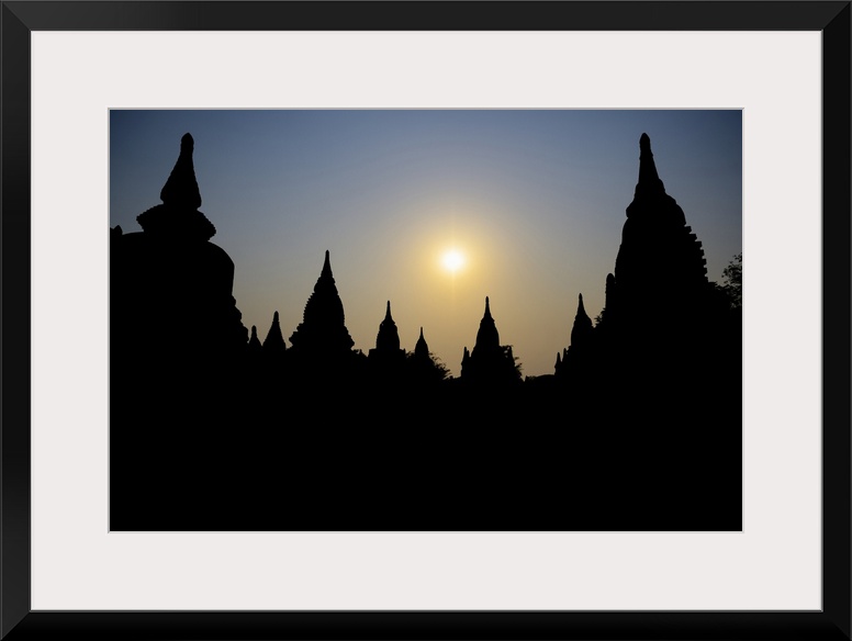 <p>Silhouetted Buddhist temple at sunset; Bagan, Mandalay Region, Myanmar</p>