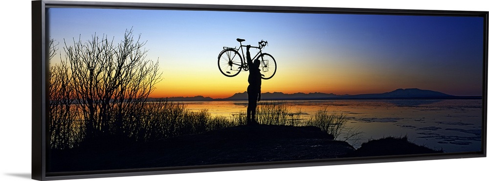 <p>Panoramic photograph of man holding bike in air at shoreline at dusk with mountains in the distance.</p>