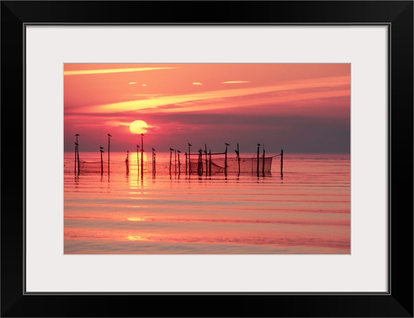 <p>Silhouettes of birds perched on fishing net stakes against a glowing sky at sunset that reflects off the water of Chesapeake Bay as it rolls to shore. | Location: Smith Beach, Onancock, Virginia, USA.</p>