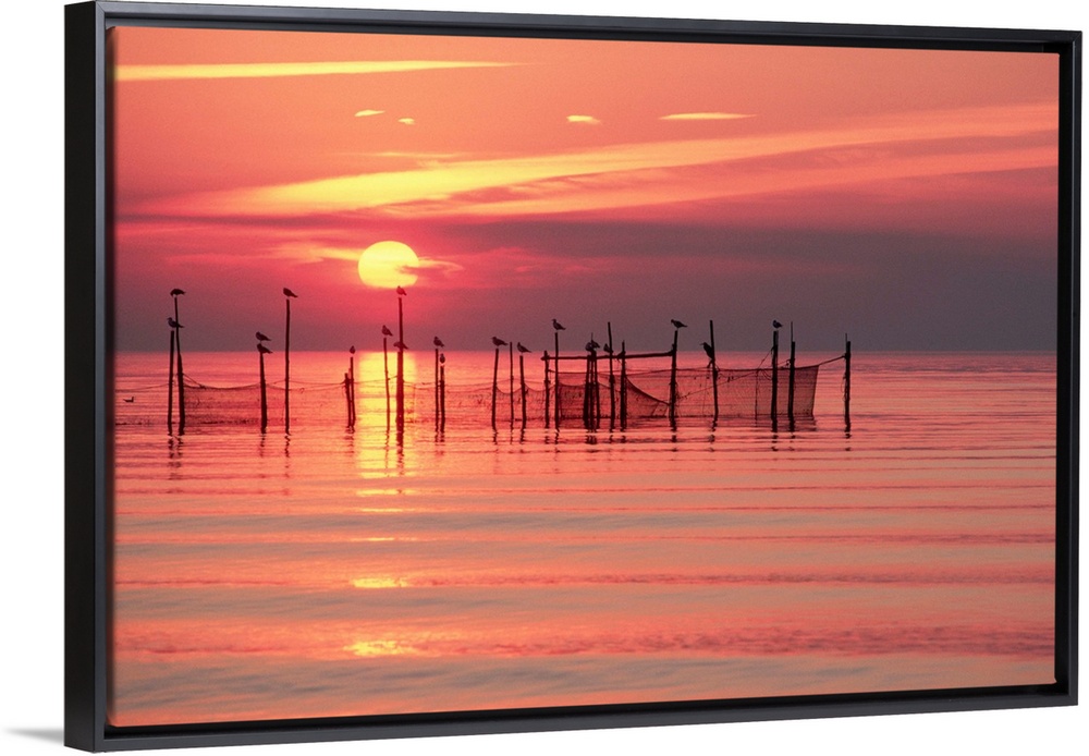 <p>Silhouettes of birds perched on fishing net stakes against a glowing sky at sunset that reflects off the water of Chesapeake Bay as it rolls to shore. | Location: Smith Beach, Onancock, Virginia, USA.</p>