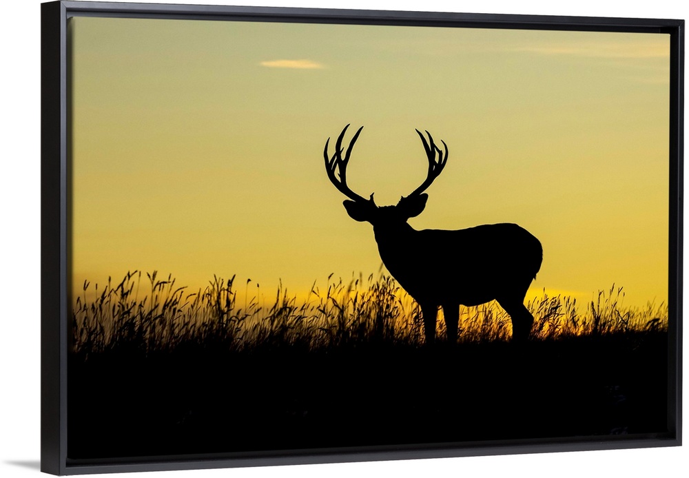 <p>Silhouetted mule deer buck (Odocoileus hemionus) standing in grass during a golden sunset; Steamboat Springs, Colorado, United States of America</p>