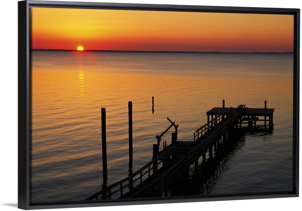 <p>A long pier is photographed reaching out into the ocean with the sun setting just on the horizon.</p>