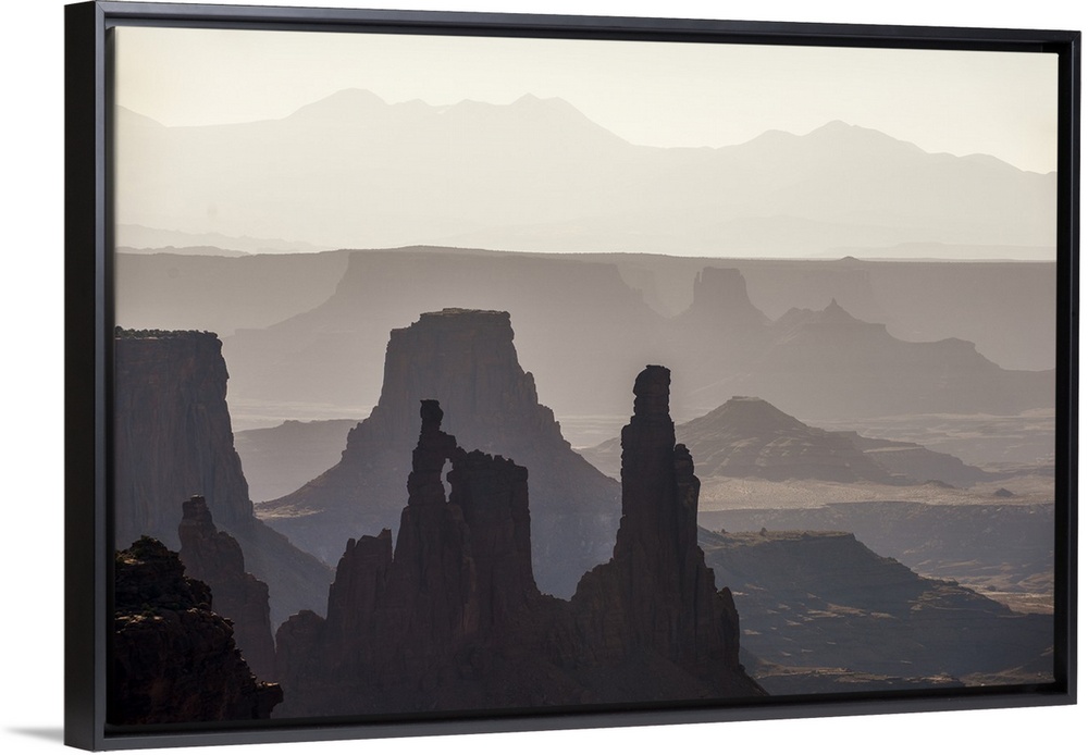 <p>Hazy morning light gives the eroded rock structures a soft blue hue in Canyonlands National Park, Moab, Utah.</p>