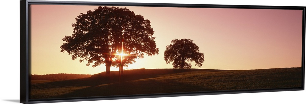 <p>Large trees stand in an open field and are silhouetted by the sunset just behind them.</p>