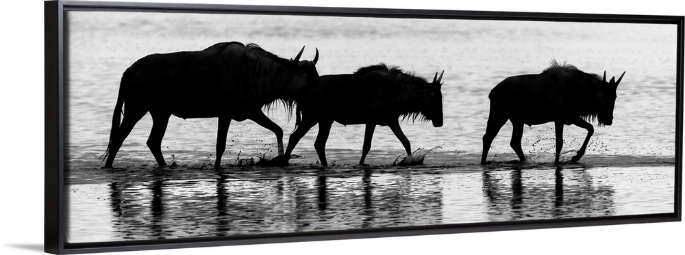 <p>Three silhouetted wildebeests walking through water in Kenya, Africa.</p>