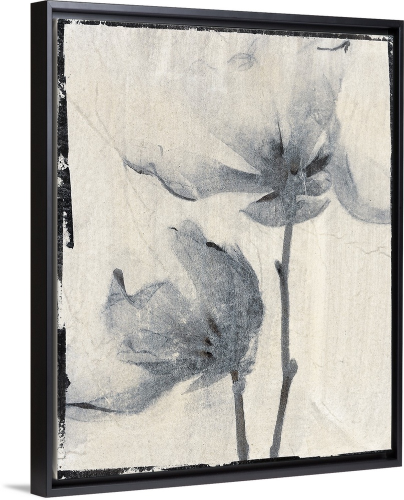 <p>Vertical contemporary painting of flowers in faded shades of grey with a rough, simple black border.</p>