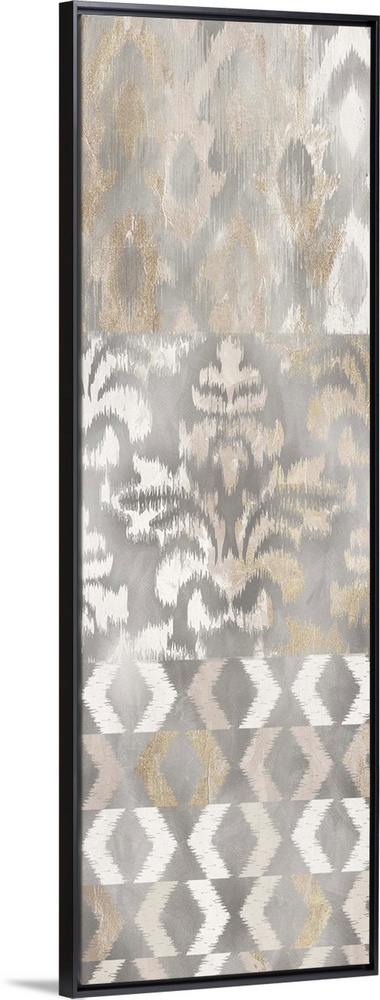 <p>Large panel decor with brown, silver, white, and gold colored ikat patterns.</p>