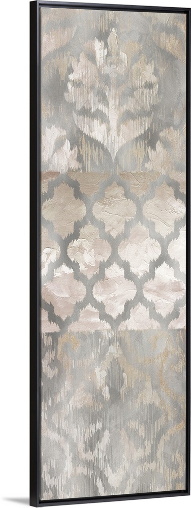 <p>Large panel decor with brown, silver, white, and gold colored ikat patterns.</p>