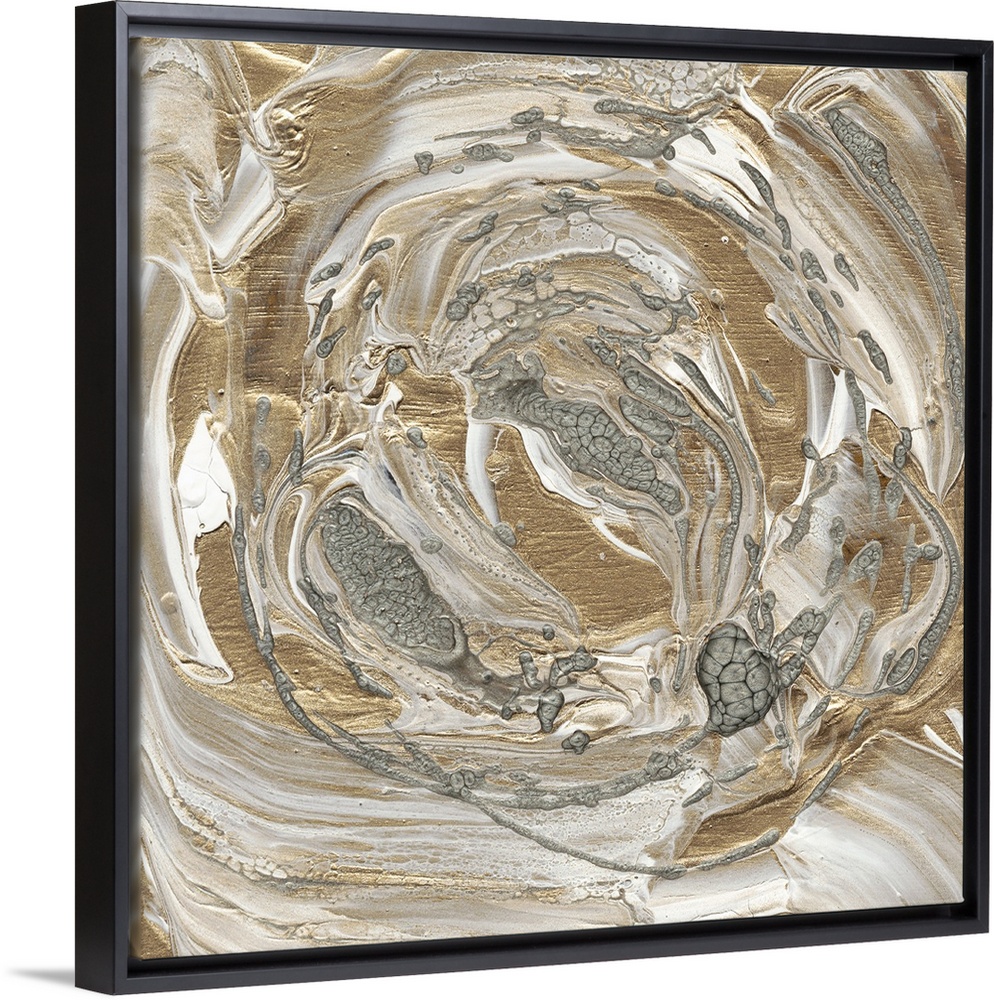 <p>Abstract painting of swirls of white, gray and gold with drips of overlapping silver.</p>