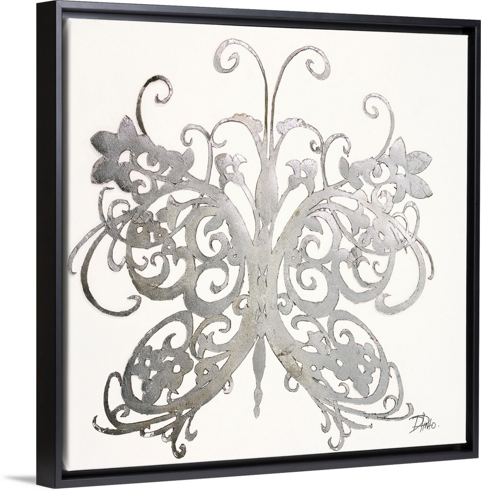 <p>A shiny silver designed butterfly on a solid white background.</p>