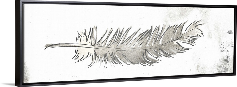 <p>Contemporary painting of a long grey feather, embellished with paint splatters.</p>