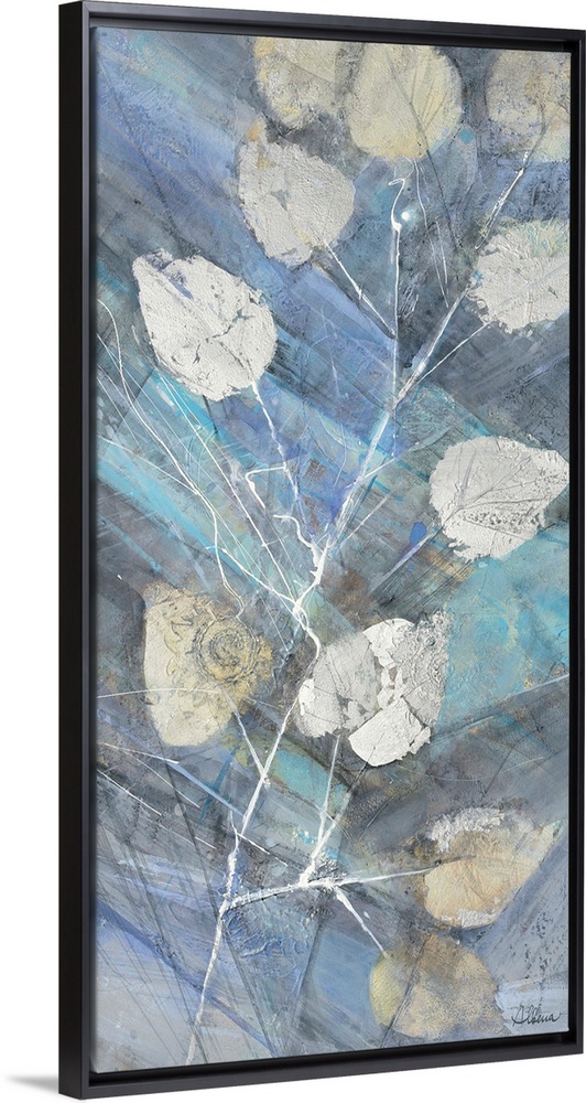 <p>Contemporary artwork of silver leaves against a blue toned background.</p>