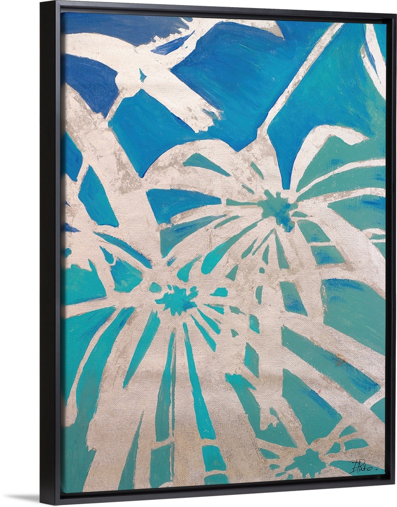 <p>Contemporary abstract painting of a tropical looking palm fronds in light gray silhouette against a blue green background.</p>