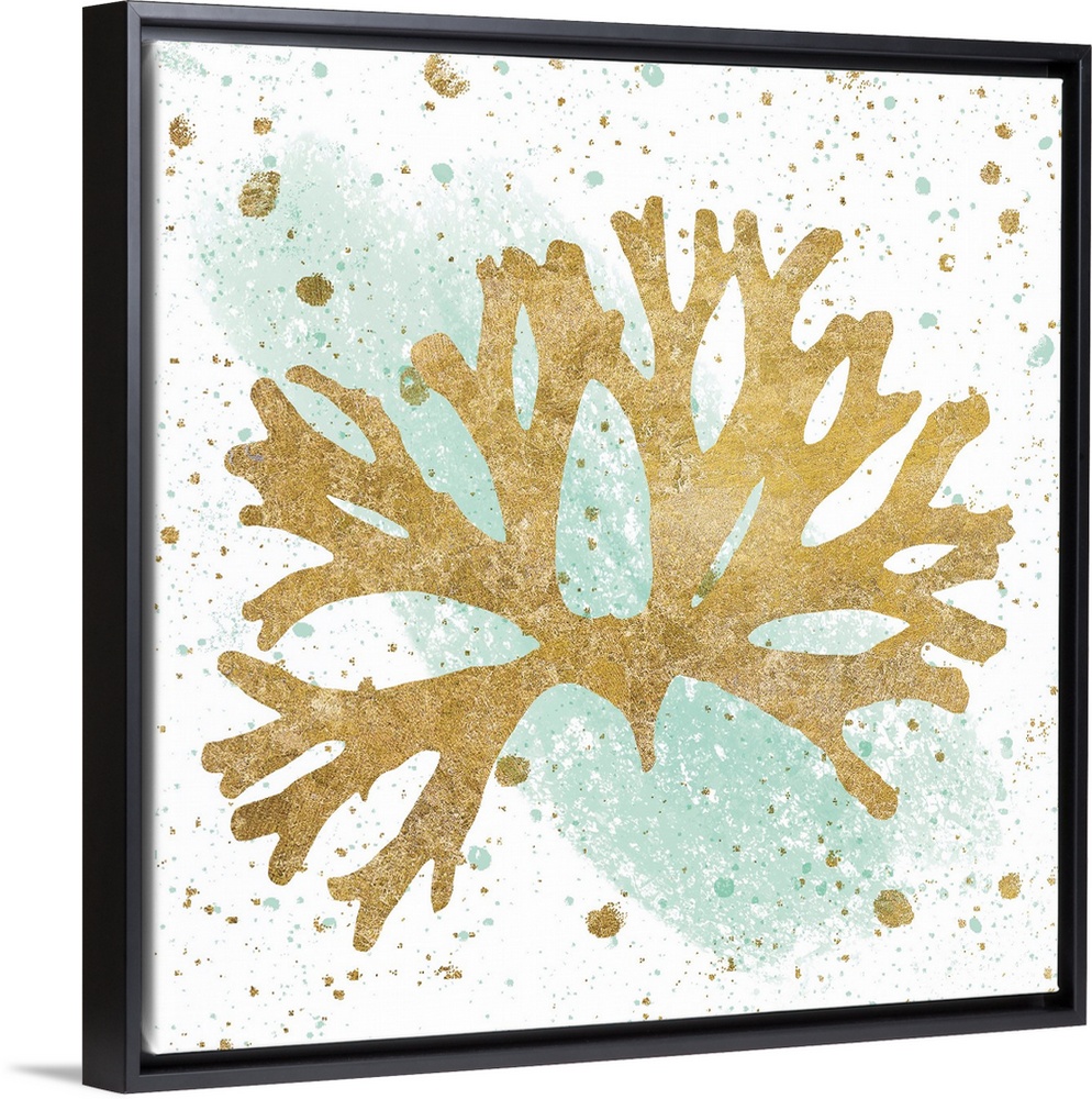 <p>Square art with metallic gold sea coral on a white and sea foam green background with gold and sea foam green paint splatter.</p>
