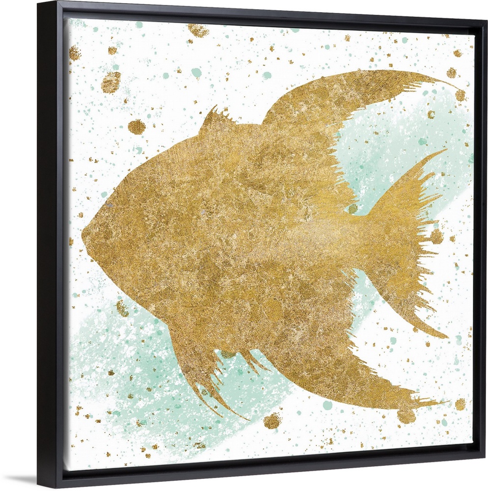 <p>Square art with a metallic gold fish on a white and sea foam green background with gold and sea foam green paint splatter.</p>