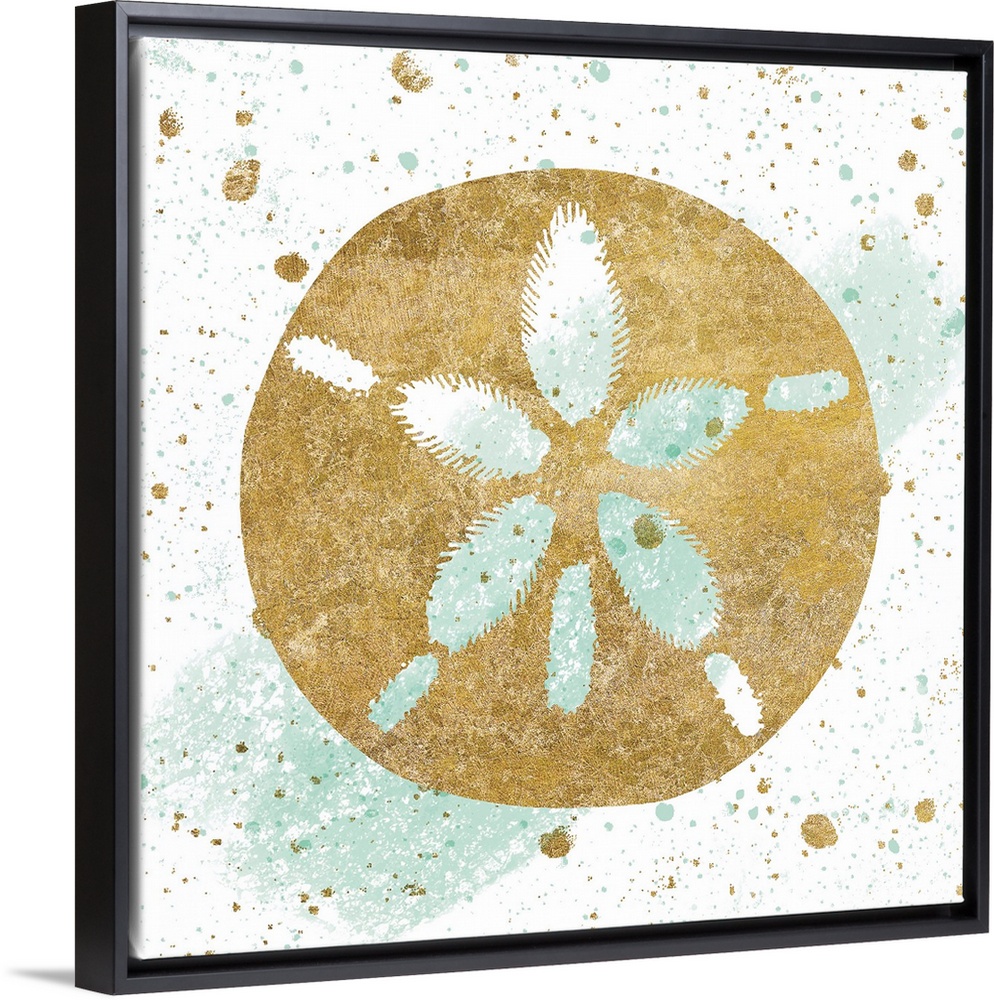 <p>Square art with a metallic gold sand dollar on a white and sea foam green background with gold and sea foam green paint splatter.</p>