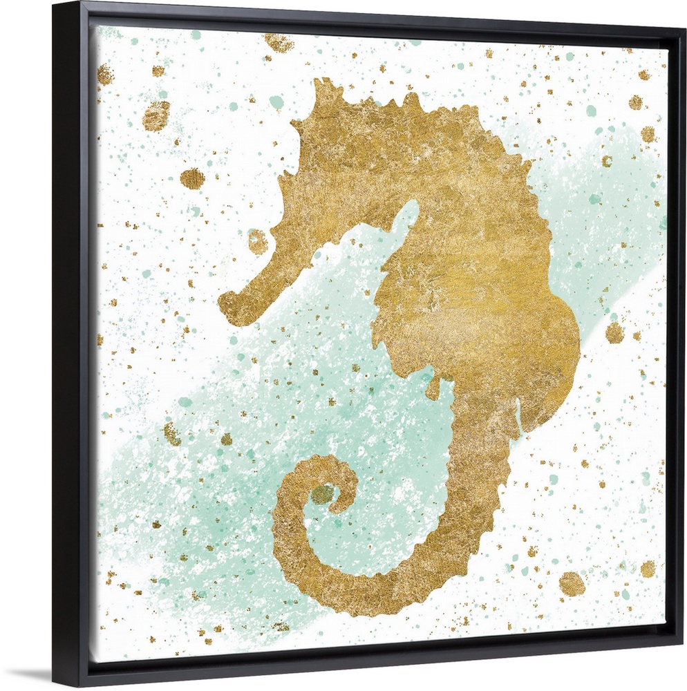 <p>Square art with a metallic gold seahorse on a white and sea foam green background with gold and sea foam green paint splatter.</p>