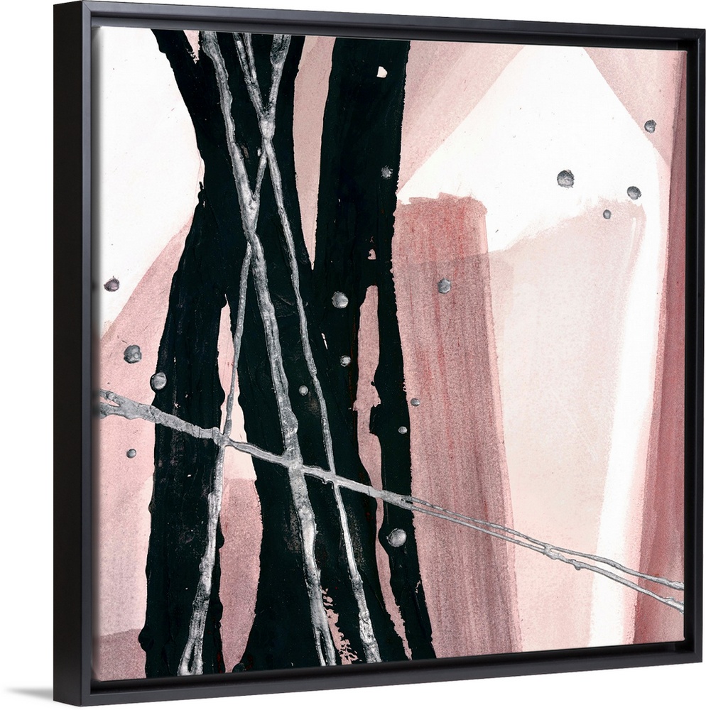 <p>Square abstract painting with bold, black, vertical lines that have thin silver lines and dots on top on a background made up with muddy shades of pink and purple.</p>