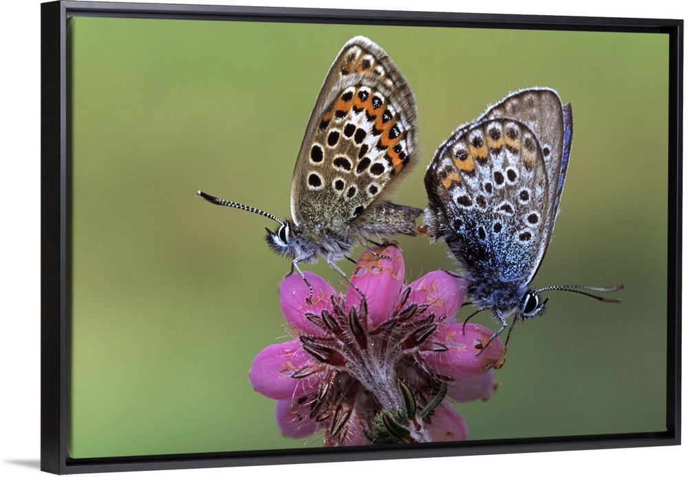 <p>Silver-studded Blue butterfly (Plebejus argus) pair mating on flower, Europe</p>