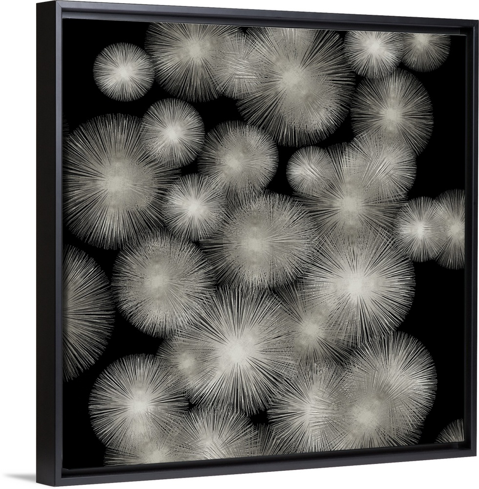 <p>Square decor with circular shapes made out of thin silver lines angled out and disappearing into their silver centers, all on a black background.</p>