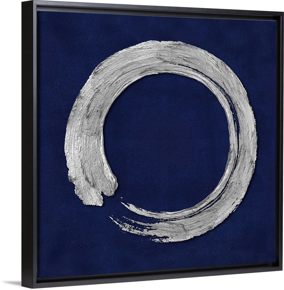 <p>This Zen artwork features a sweeping circular brush stroke in silver over a mottled blue background.</p>