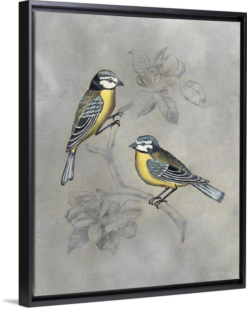 <p>Contemporary painting of two birds on perched on an illustrated branch with a silver background.</p>