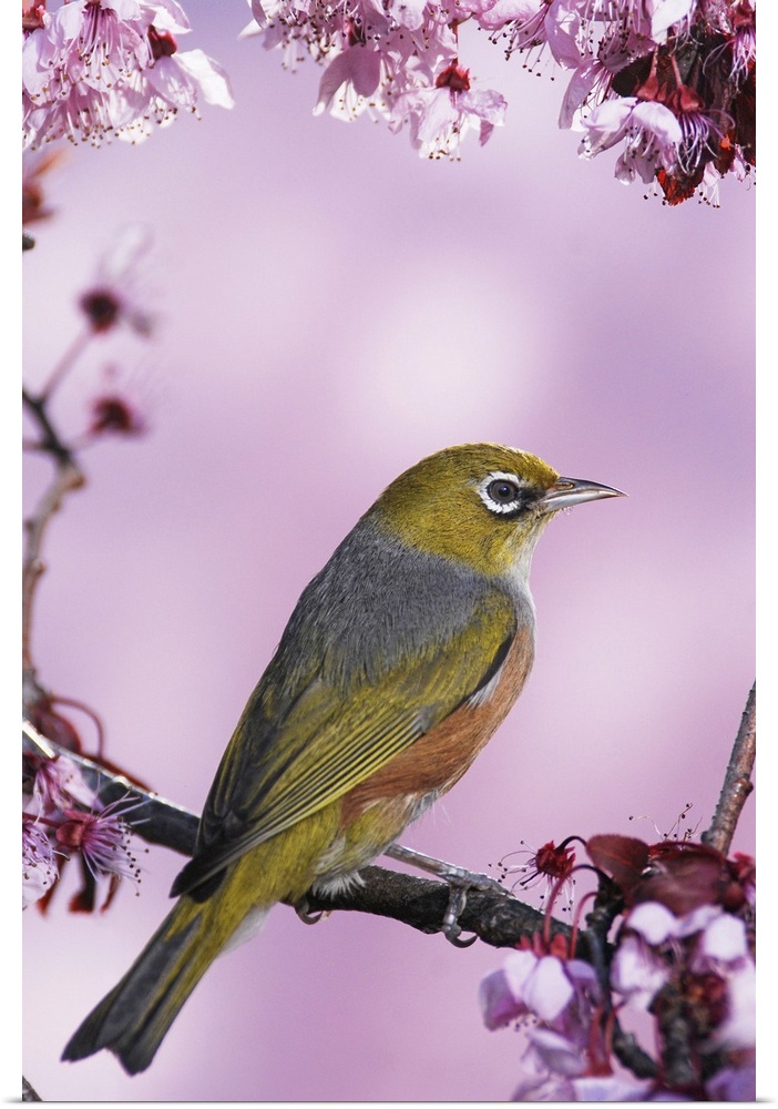 <p>Silvereye (tauhou) perches on a cherry blossom in Spring, Christchurch</p>