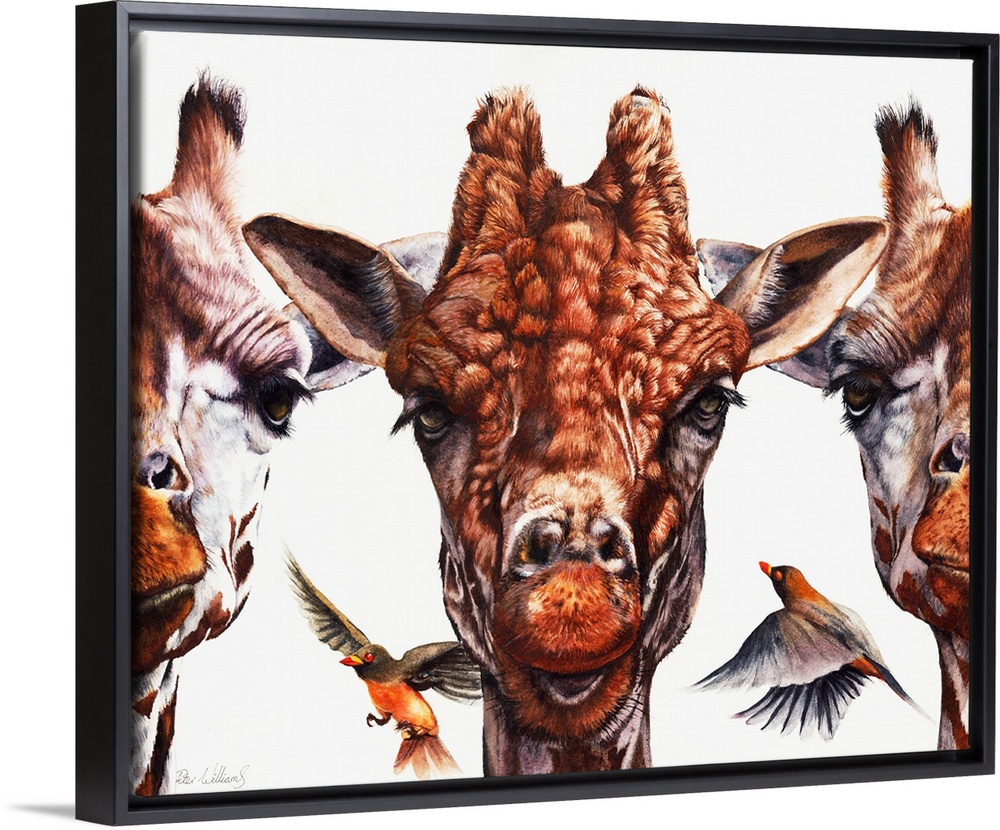 <p>'Simple Minds' is an original watercolor painting. It depicts three giraffes portraits in a row, with a couple of oxpecker birds fluttering around their heads to add a little movement to the composition. This is quite a striking, eye catching painting which grabs attention as soon as anyone walks in the room.</p>