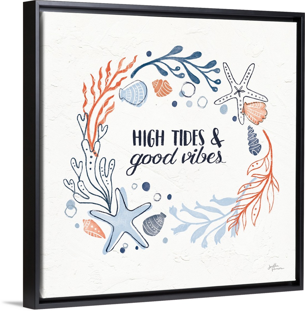 <p>"High Tides and Good Vibes" with coral and blue ocean themed illustrations on a square white textured background.</p>