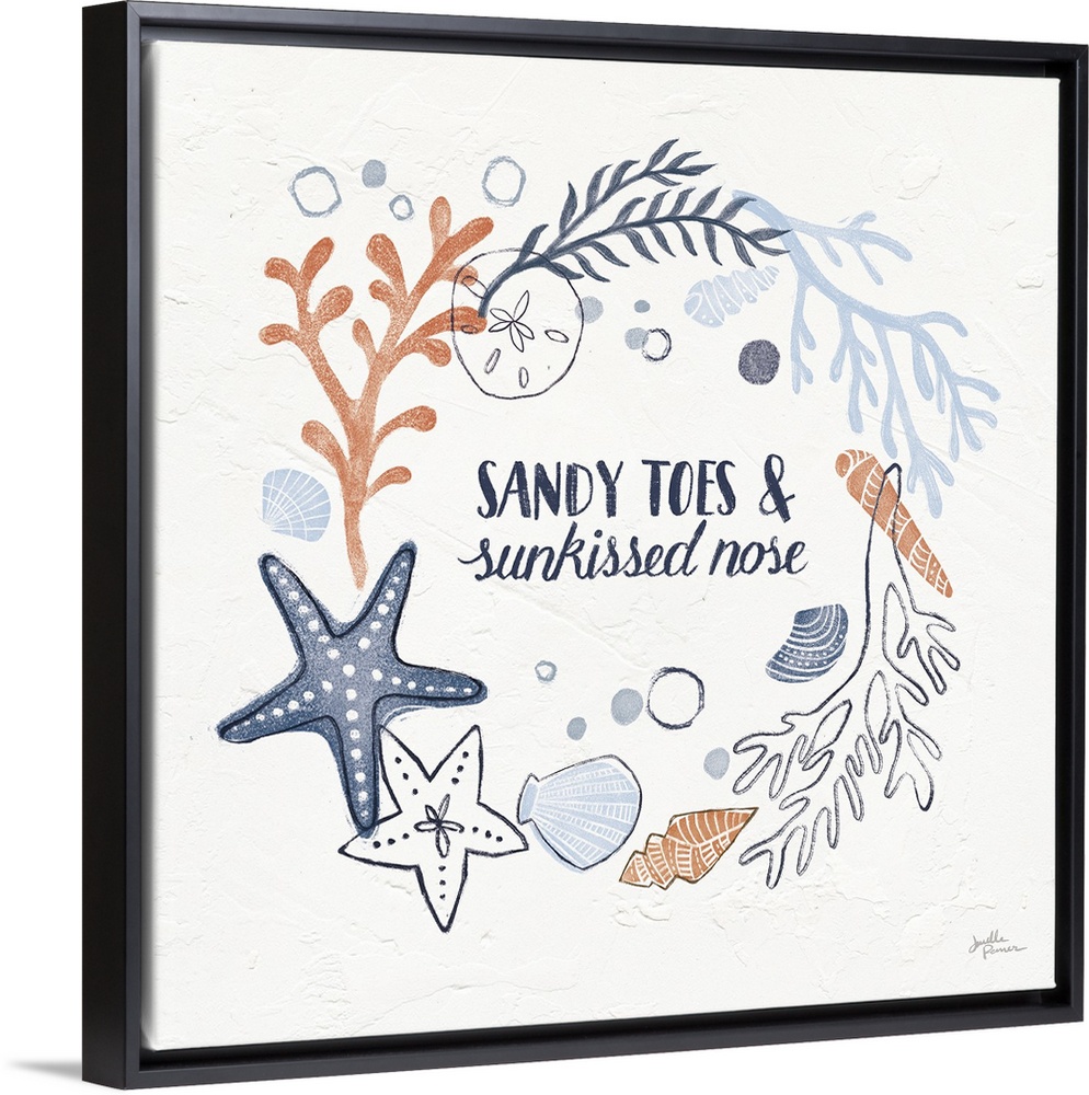 <p>"Sandy Toes and Sun Kissed Nose" with coral and blue ocean themed illustrations on a square white textured background.</p>