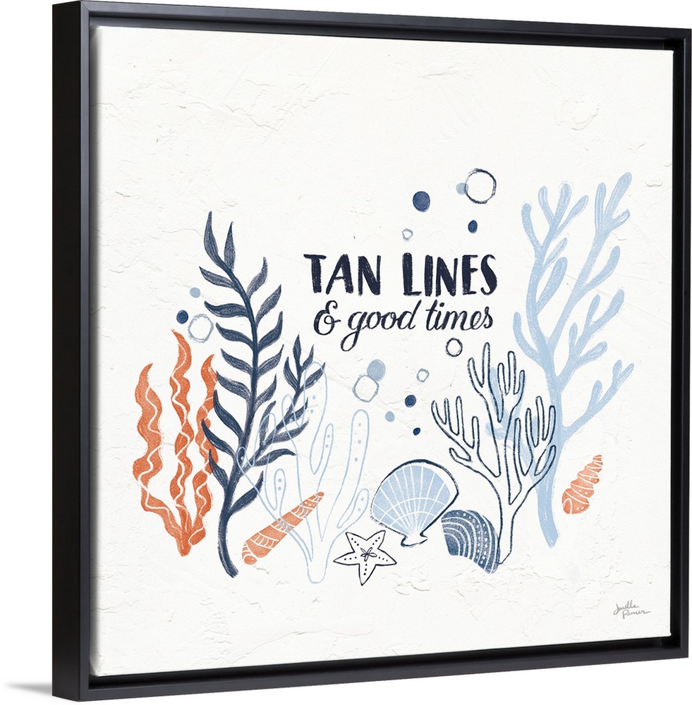 <p>"Tan Lines and Good Times" with coral and blue ocean themed illustrations on a square white textured background.</p>