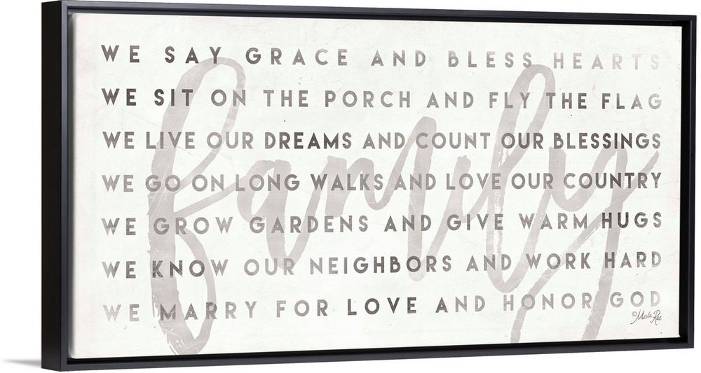 <p>"Family: We say grace and bless hearts, we sit on the porch and fly the flag, we live our dreams and count our blessings, we go on ling walks and love our country, we grow gardens and give warm hugs, we know our neighbors and work hard, we marry for love and honor God"</p>